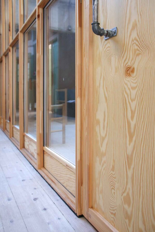 Partitioning walls define interior layouts, create acoustic separation, and support flexible use of space in modern buildings. For professional environments, solutions must combine visual quality, durability, and reliable documentation. At a:gain, we develop glass partition wall systems designed for professional interiors. Our approach is to reuse existing high‑quality glass sourced from Danish transformation and demolition projects, resulting in a documented lower CO₂ impact compared to partition walls made with new glass materials. The Tystø partitioning wall system integrates this reused glass in a wooden frame, creating a distinct architectural expression and warm interior atmosphere. Its construction differs from conventional floor‑to‑ceiling glass walls, offering both transparency and material tactility.