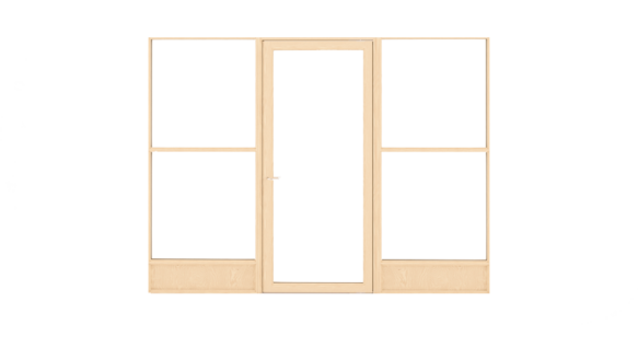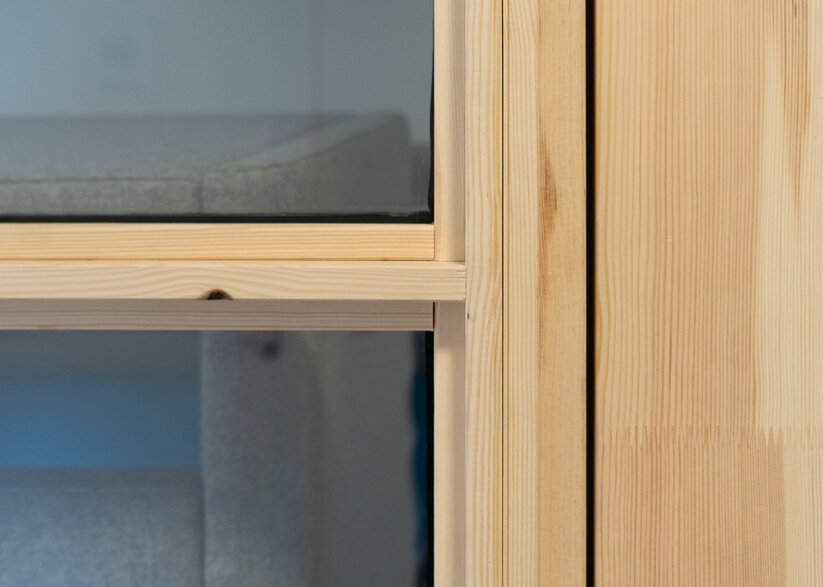 Door leaf, made out of discarded, solid pine wood with partitioning glass in different thicknesses to fit your specific acoustic performance wishes and needs.